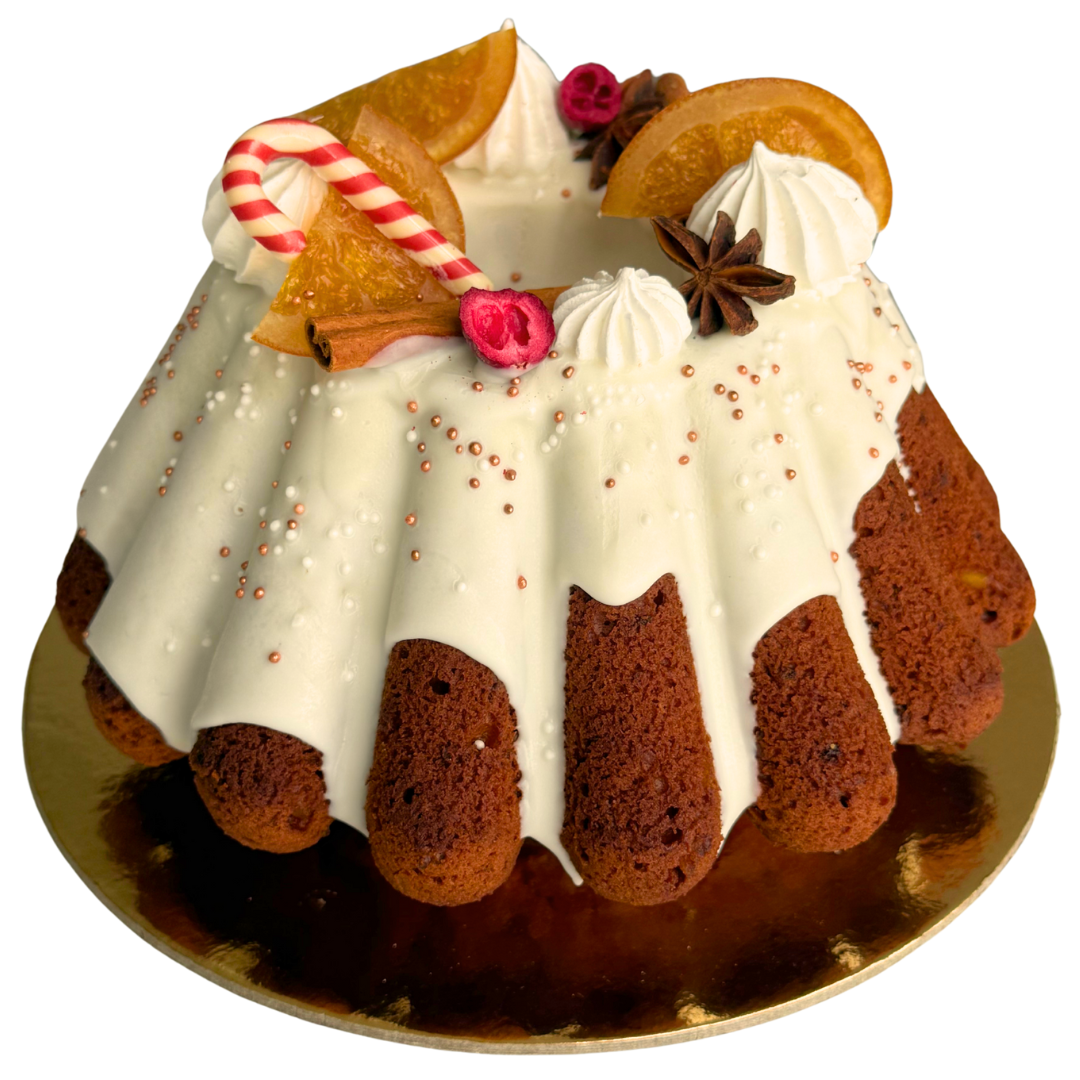 Padengtas balto šokolado glaistu ir papuoštas cukruotų apelsinų griežinėliais, morengais, cinamono lazdele, anyžiais, liofilizuotomis spanguolėmis bei cukriniais papuošimais.
