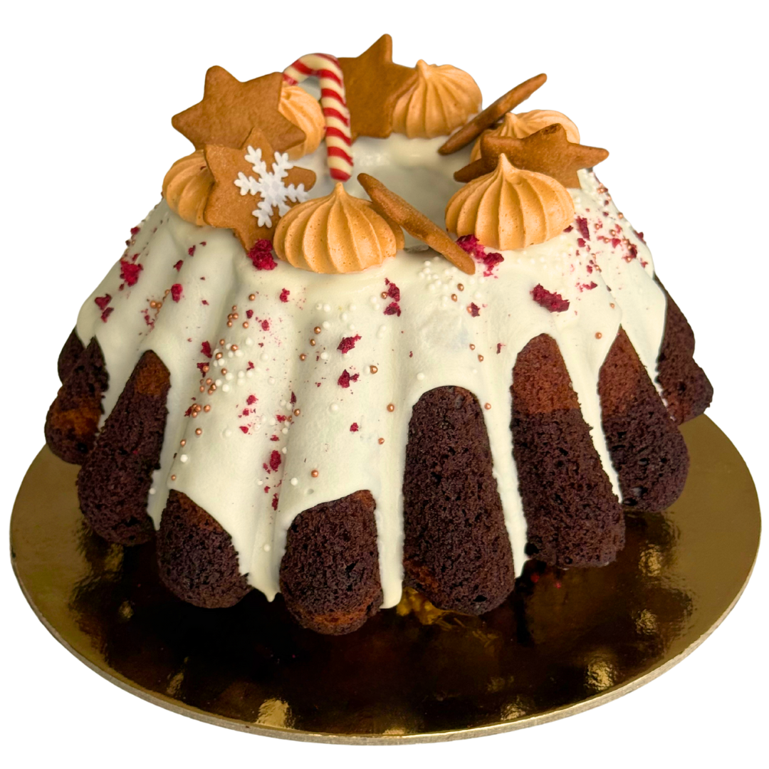 Papuoštas balto šokolado glazūra, morengais, imbieriniais sausainiais, šokoladine lazdele, vaflinėmis snaigėmis ir liofilizuotų vyšnių trupiniais.
