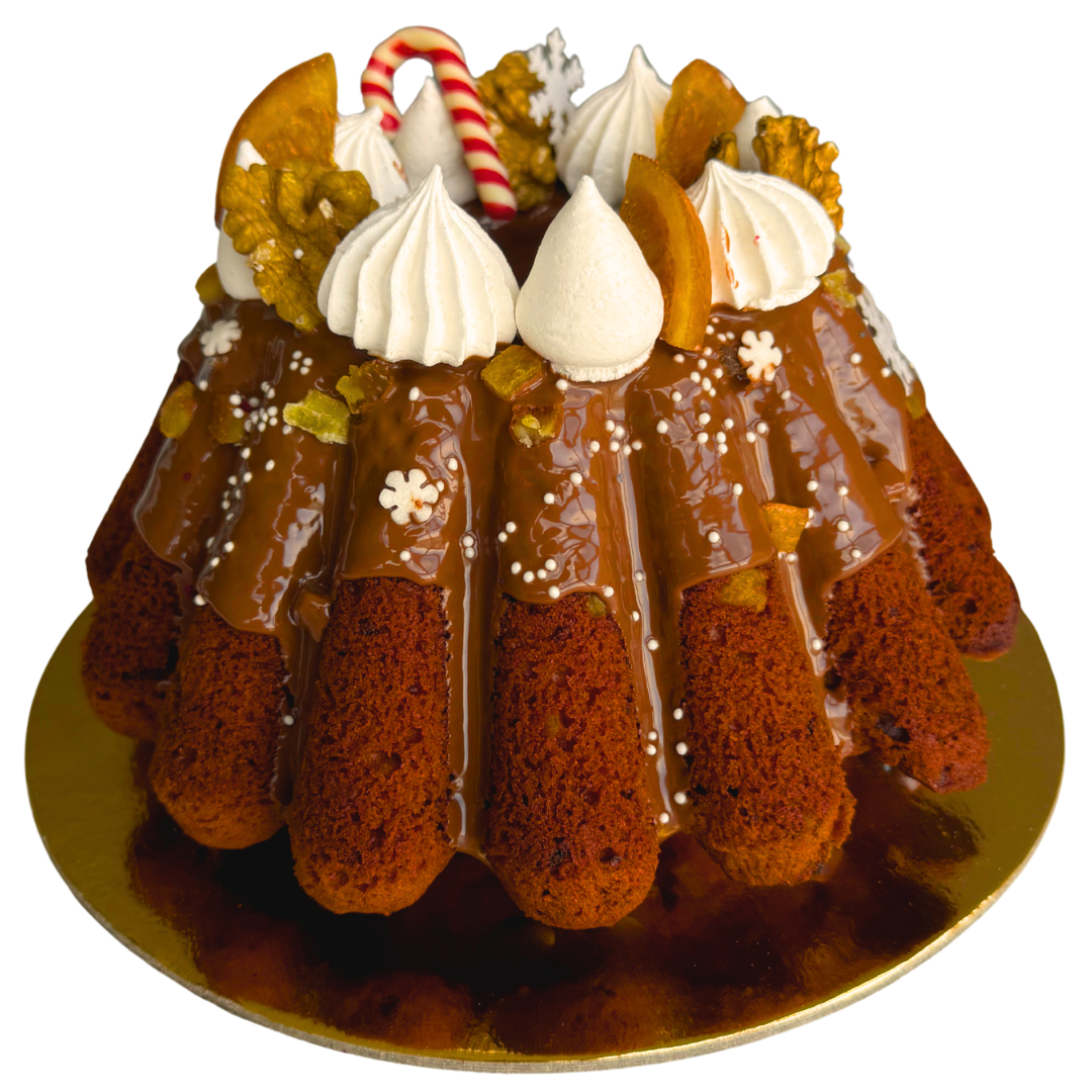 Padengtas pieninio šokolado glazūra ir papuoštas apelsinų griežinėliais, graikiniais riešutais, morengais, šokoladine Kalėdine lazdele ir cukriniais papuošimais.