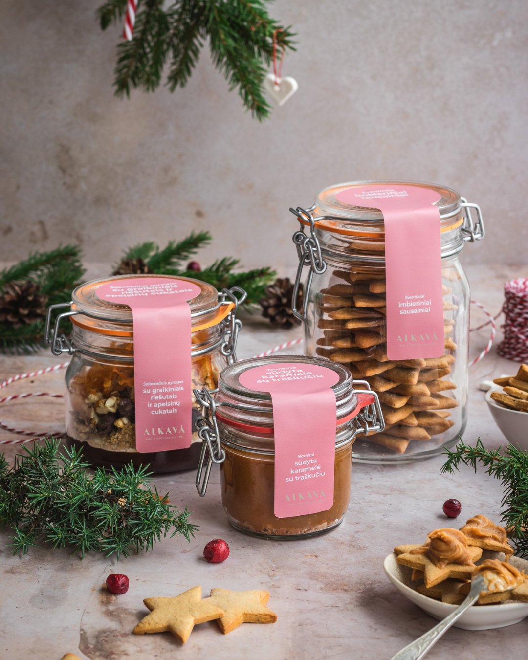 Variacijos: už papildomą mokestį galime dovaną pateikti individualiai. Užklijuoti Jūsų lipduką, pridėti Jūsų kortelę, priderinti kito atspalvio kaspiną, pridėti atsiųstas Jūsų detales ir kt. Susisiekite info@alkava.lt arba įrašykite komentare.