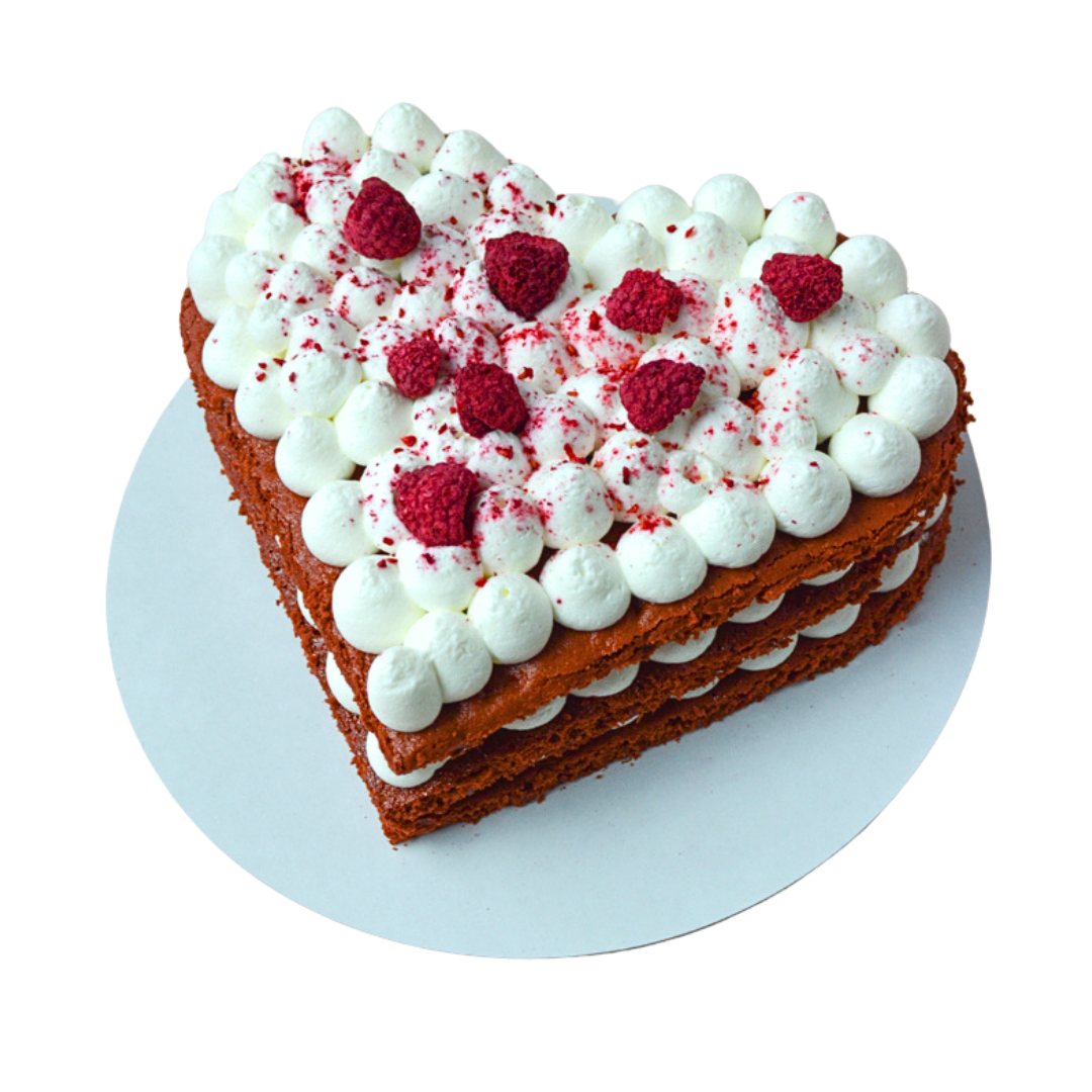 Meilės konditerijai įkvėptas, širdelės formos Red Velvet-raudonojo aksomo tortas. Avietiniai biskvitai pertepti maskarponės kremu su avietėmis ir raudonųjų uogų tyrės kremu.
