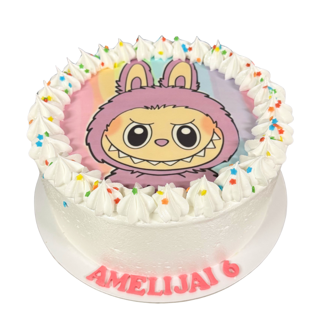 Tortas su spausdintu horizontaliu paveikslėliu, apteptas lengva grietinėle, papuoštas švelniais pabarstukais. SVARBU: Komentarų skiltyje viršuje įrašykite vardą, metus ar kitą svarbią informaciją.