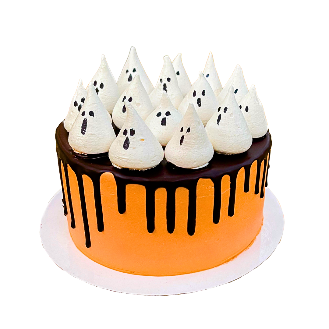 Grietinėle apteptas tortas su šokoladu ir morenginiais vaiduokliukais.