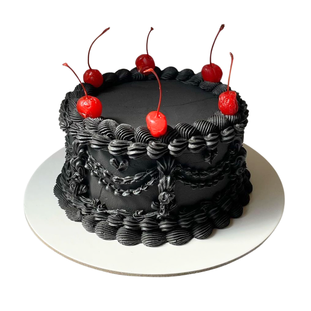 Juodas vintažinis tortas su vyšniomis.