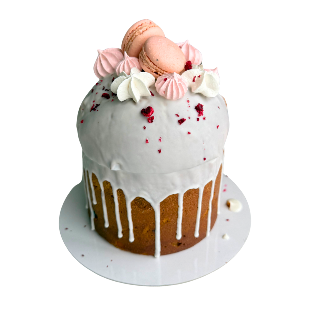Itališko recepto prabangus Velykinis pyragas su džiovintais vaisiais, aplietas aukščiausios rūšies šokoladu, papuoštas pavasariška Velykine dekoracija.